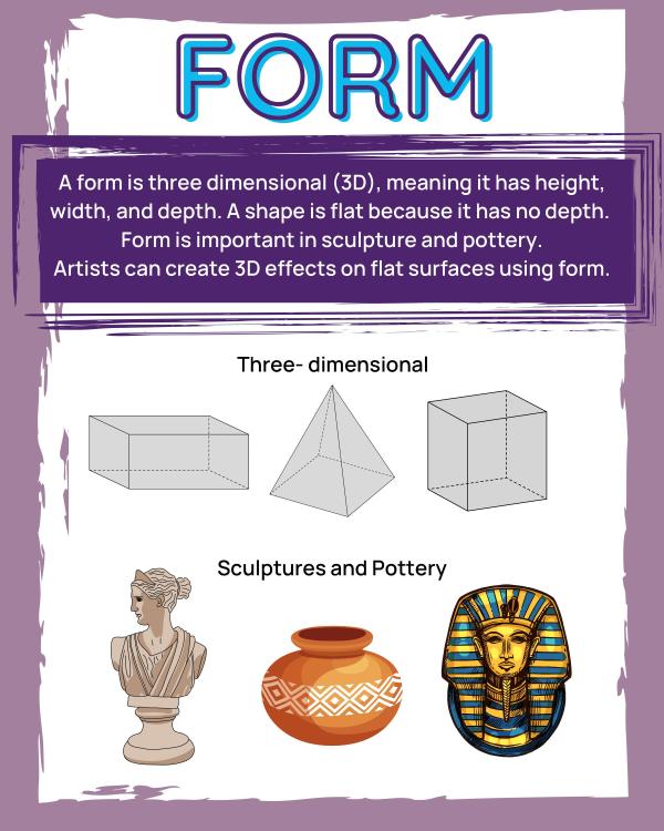 A form is 3D like a cube or a cone. It has height, width, and depth.