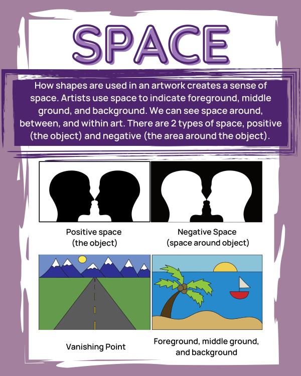 Space is created when an artist arranges shapes in a piece of art. Artists can create a foreground and a background or a vanishing point. There are two types of space: positive (the object/subject) and negative (the empty area between shapes).