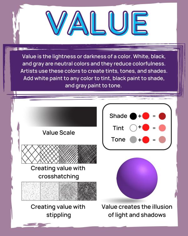 Value describes the lightness or darkness of a color. Artists use it to create the illusion of light and shadows in a painting.