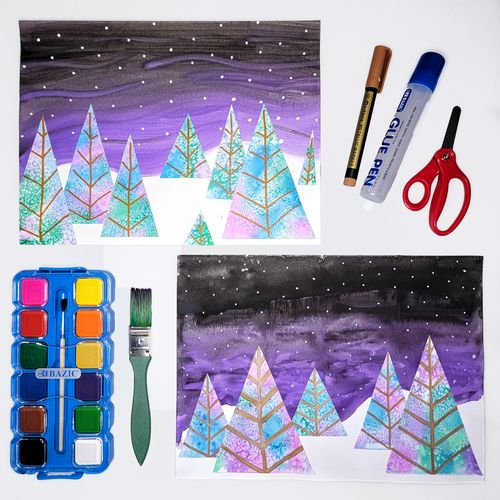 1. Use watercolors to paint a wintery background on watercolor paper. Use blues and purples. Mix in a bit of gray and black if you’d like it to look like a nighttime scene.