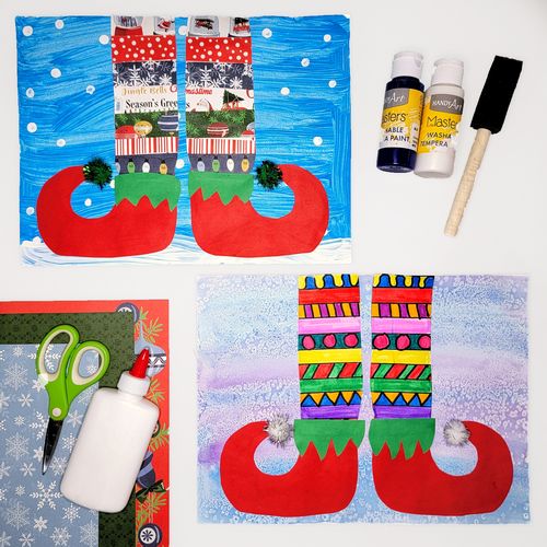 5. Cut elf shoes out of the red paper and cut fringe out of the green paper.