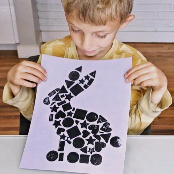 Easter art made EASY and FUN! Try this simple bunny print project with just foam stickers, paint, and paper! Your little artist will love watching their bunny appear like magic! Download the printout, then print the bunny outline. Next, add foam sticker shapes inside the bunny outline, roll paint on it (a Brayer roller is best but a foam roller will work, too!), and press a piece of colored cardstock on. Finally, gently pull the cardstock off.