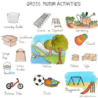 Gross motor abilities are crucial for our children. From birth it is ideal to give them freedom of movement such as putting them on a flat surface so they can move their legs, arms and head to take in their surroundings. Also no need for restricting devices, such as swings or bumbos or jumpers; babies will be happy to be on the floor on their back or in your arms.