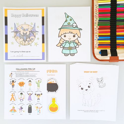 You’ll get several activities like coloring pages, dot-to-dots, scissor practice, and a maze. You can also challenge your kids to a memory game. The PDF includes cut-out Halloween characters, so you can start playing in just a few minutes. There are a few pages that kids can use to tell a friend or family member about their Halloween costume, too. It’s pages and pages of fun!