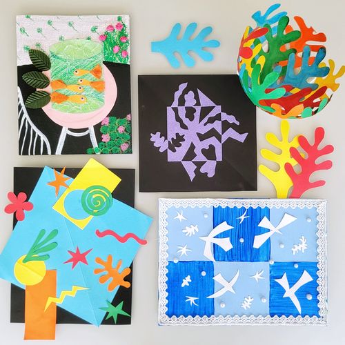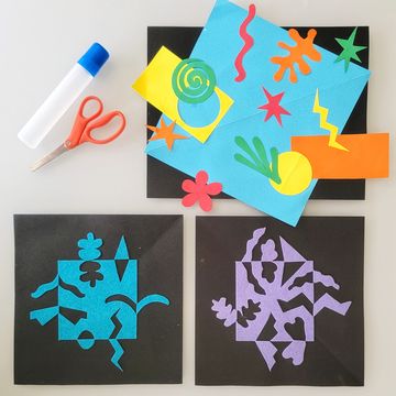When working with cut-outs, Matisse would place and re-place the pieces of paper until they looked exactly right to him. Kids will do the same while learning these two techniques! The first project involves more abstract shapes drawn on brightly colored paper. The second project teaches kids about negative space and symmetry in art.