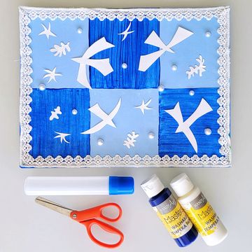 In this project, kids get their first taste of Matisse's work with abstract cut-outs. They'll start by blending their own shades of blue paint for the background. Then, they'll draw doves and abstract shapes to be glued on the background. A lace border is the perfect kid-friendly stand-in for Matisse's more detailed work.