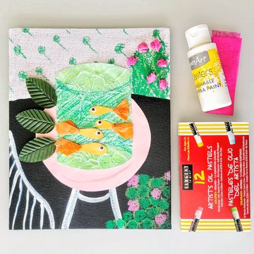 This piece is the perfect example of Matisse's brilliant use of color. Orange, blue, green, yellow, pink—kids will put all of these colors to work in creating this mixed-media reproduction. Oil pastels and paint are used in the background, while tissue paper and a plastic deli sheet add dimension in the foreground.