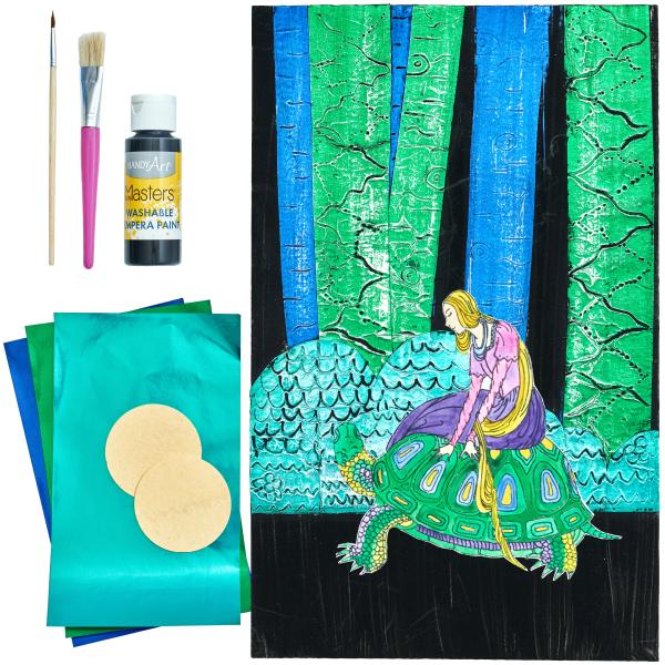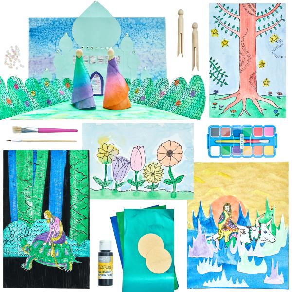 This art kit celebrates Sterrett’s illustrations and invites children to step into her magical world, too! They’ll design four projects that are inspired by Sterrett’s most famous pieces. Along the way, they’ll learn about Sterrett’s life, her artistic style, and the fairy tales she illustrated. Don’t miss the new materials in this art box! Kids will get their hands on metallic foil paper and an interesting mixture of watercolor paint, flour, and glue.