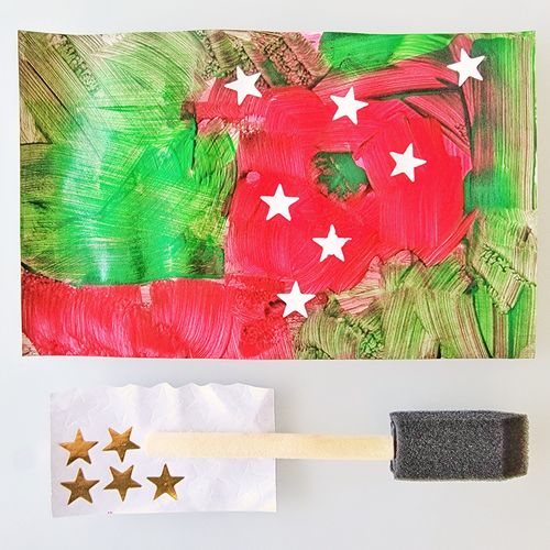 Stickers in a variety of basic shapes, tempera or acrylic paint, paintbrushes, and cardstock or watercolor paper