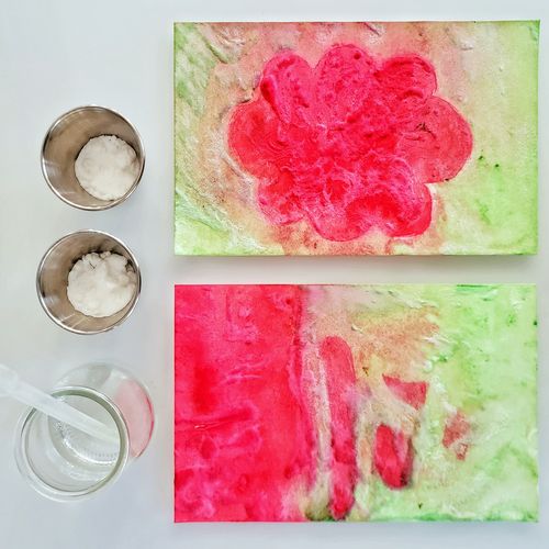 Squeeze paint into jars and add about two tablespoons of baking soda per jar. Mix well. Use the mixtures to paint the paper. Pour vinegar into a small jar. Your child can use a pipette to suck up the vinegar and drop it onto the paint. It will magically fizz!