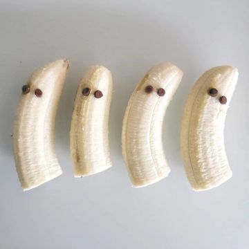 Cut bananas in half and add mini chocolate chips as the eyes.