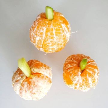 Peel clementine oranges and slice a few thin pieces of celery. Gently press the celery into the top of the orange so it looks like a pumpkin stem. Snack is served!