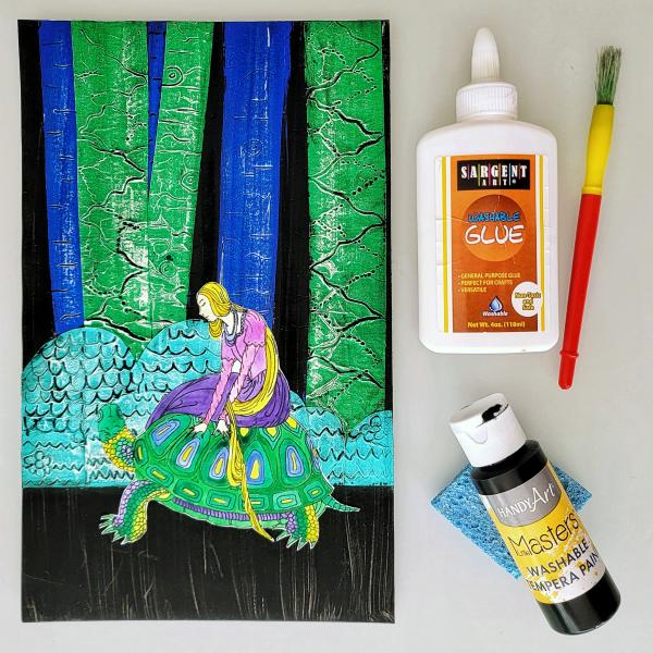This pack contains all of the supplies you'll need in order for 10 or more children to complete a reproduction of Blondine on Tortoise using metallic foil paper and black paint for a strong contrast. To give you a head start on prepping the lesson, a reproducible PDF tutorial will be emailed to you before the art box ships.